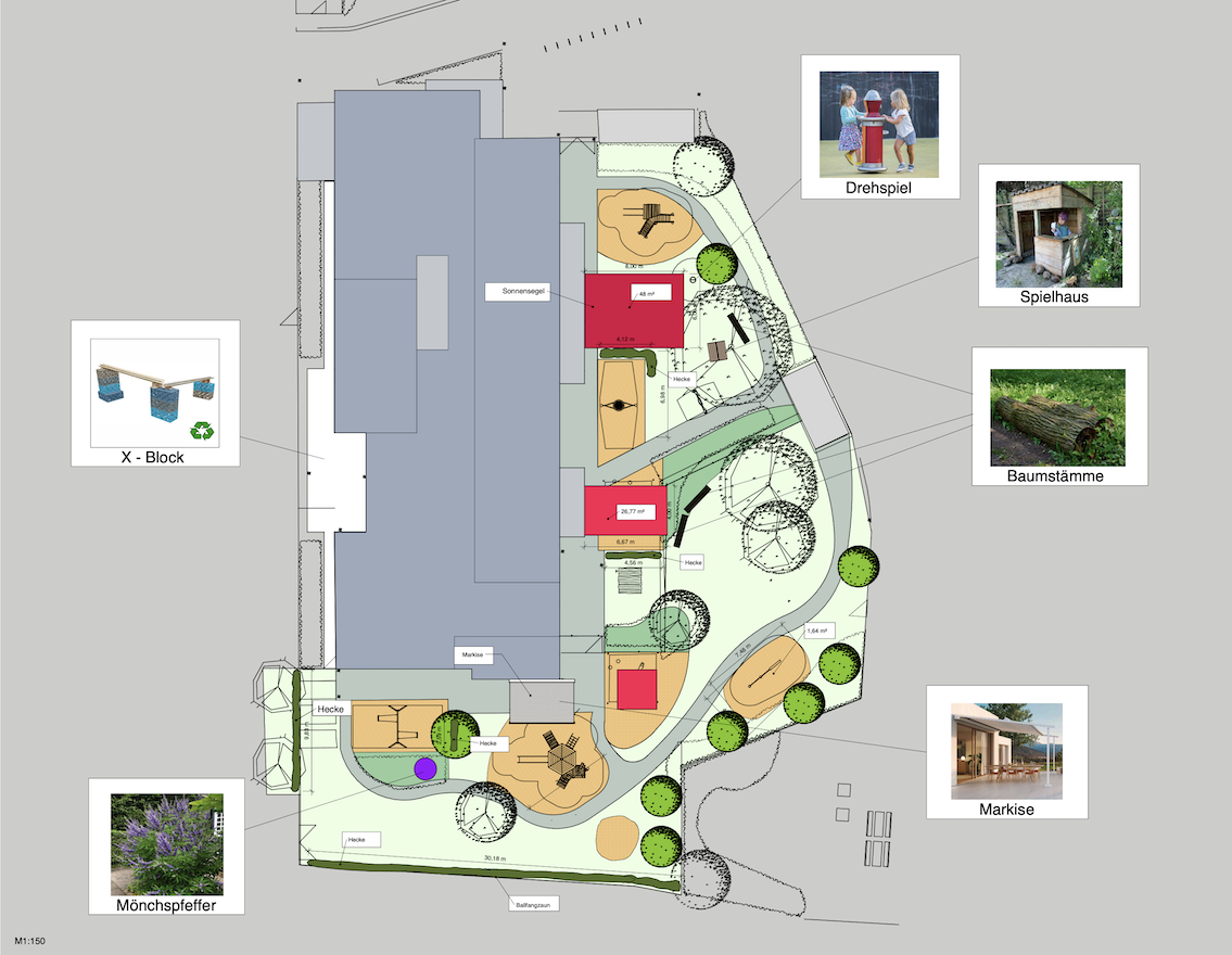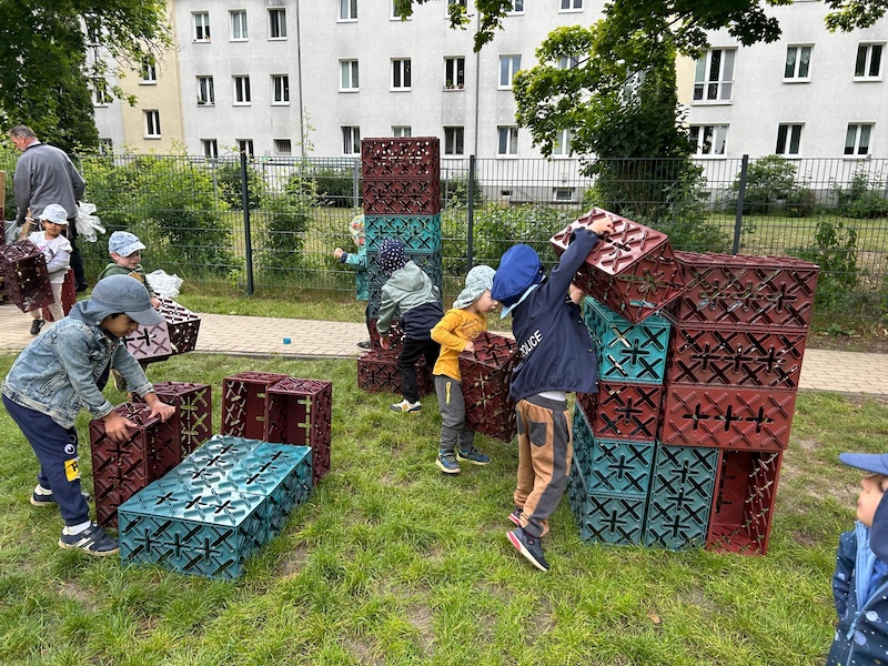 Die Krippen- und Kita-Kinder wünschen sich mehr Grünflächen mit insektenfreundlicher und klimaresilienter Bepflanzung – Orte, die Gemütlichkeit, Naturerfahrung, kühle Plätze, Schatten und Rückzugsräume bieten. Zudem sollen drei hochwertige Spielgeräte mit hohem Spielwert installiert werden, darunter ein Kreisel auf der Fläche für die Krippenkinder. Dieser kann dann in den Nachmittagsstunden auch von den Größeren genutzt werden. Den hohen Spielwert erreichen wir durch gezielte Dynamik, gute Erreichbarkeit und flexible Nutzungsoptionen: bewegliche, kombinierbare Elemente und unterschiedliche Schwierigkeitsgrade ermöglichen altersgerechte, sinnliche und motorische Erfahrungen für alle Kinder. Die großen, flexibel einsetzbaren Bauklötze eröffnen zusätzlich die Möglichkeit für einfache Wasserspiele – eine spannende und sichere Lernumgebung, in der insbesondere Krippenkinder spielerisch Ursache und Wirkung entdecken können.