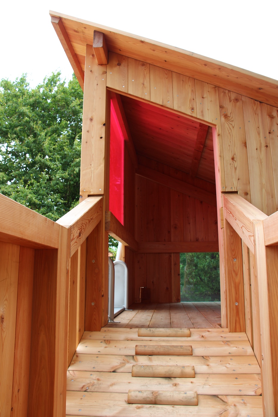 Als Materialien wurden vorwiegend langlebige und nachhaltige Holzgeräte gewählt, die speziell für diesen Projektort in Frasdorf, Bayern gefertigt wurden. Das Holz bezieht der Hersteller aus einem familiären Forstbetrieb im Lungau. Die hohe Qualität des Holzes und seiner Verarbeitung gewährleisten eine lange Lebensdauer und einfache Instandhaltung.