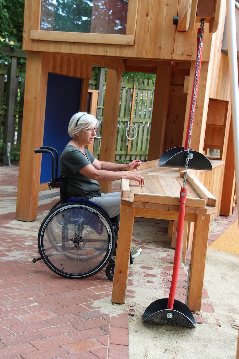 Der Schulhof ermöglicht Kindern mit unterschiedlichen Fähigkeiten gleichberechtigt Bewegung, Spiel und Gemeinschaft. Mit einer Ausnahme: ist ein Kind nicht in der Lage, seinen Rollstuhl zu verlassen, kann es die obere Etage des Kletterturmes nicht erreichen und nicht rutschen