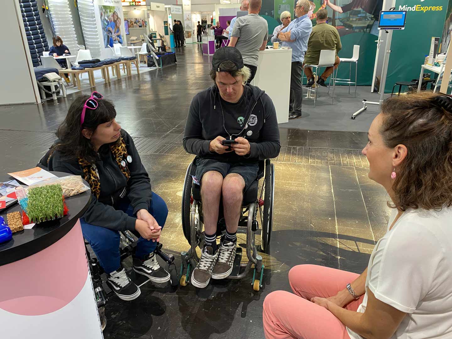 Halle 5 ist bunt gemischt. Von Entspannungstechnologien über Anbaugadgets an Rollstühle bis zu Vereinen, Rollstuhlherstellern, barrierefreien Hotels und Exoskeletten ist alles vertreten. Und wir mittendrin.