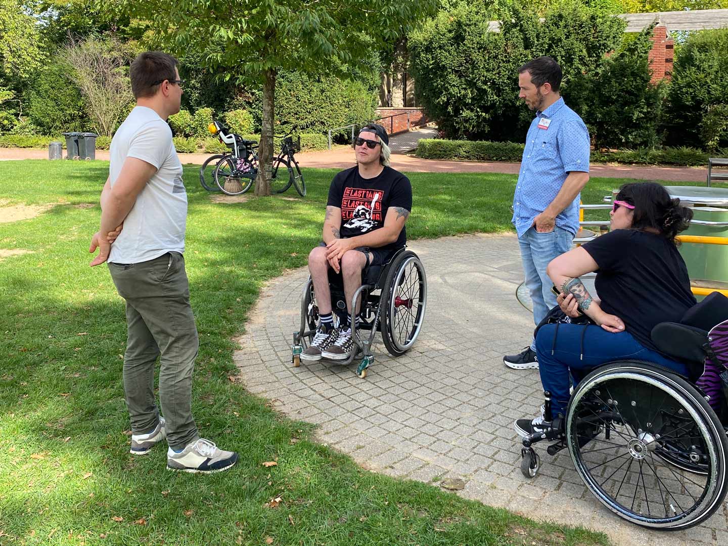 Mit dabei waren auch Michael und Tim von Freizeitpark Erlebnis. Beide setzen sich für die Barrierefreiheit in Freizeitparks ein und dokumentieren ihre Erfahrungen in Videos. Tim erklärt, dass er nur kurze Strecken und mit großer Anstrengung laufen kann. Er zeigt, dass er zwar auf dem Rasen rollen kann, das aber viel Kraft erfordert und alles andere als komfortabel ist.